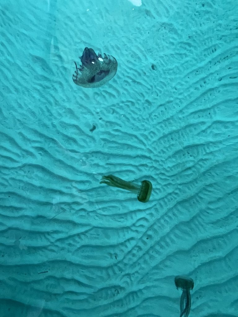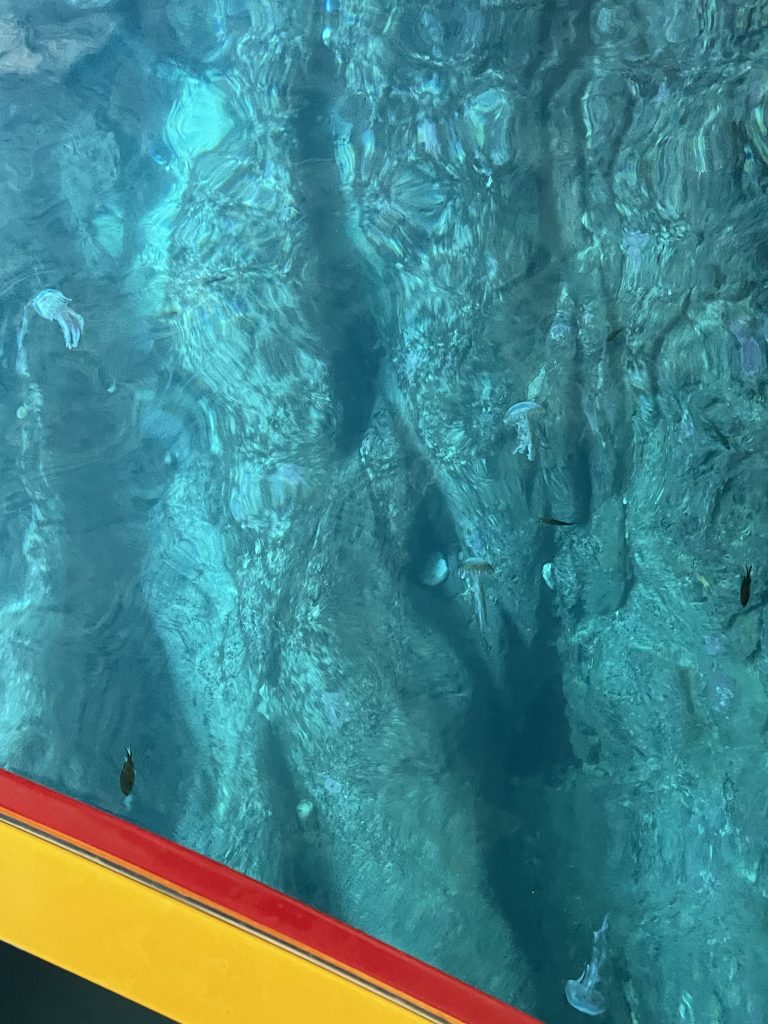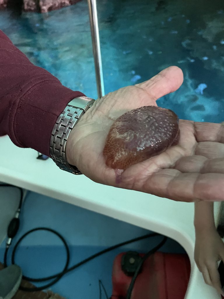 These two shots show the clarity…the water is 10-12 feet deep and you can easily see the sand ripples at the bottom. There are also a lot of jellyfish. The boat driver picked one up to demonstrate that it you pick it up with your palm, which is rougher than, say, in between your fingers where the jellyfish can sting you, then you avoid the stings. I suspect my keyboard work life renders my palms a tad softer than his.