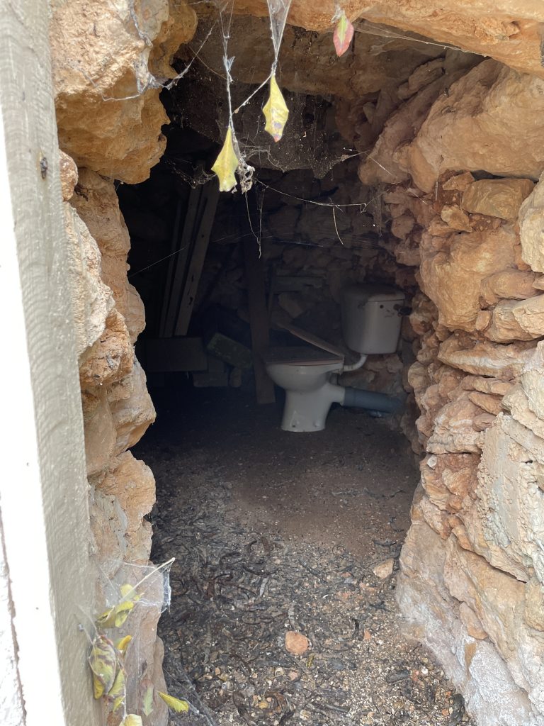 I’ve come this far, so I needed to open the door. I brushed away the debris in front with my foot, moved a rock holding it shut, and slowly opened it…giant cobwebs stretching between the inner wall and the door. Kim’s family complains about their bathroom at the Temagami cottage, but they have nothin’ on this place!