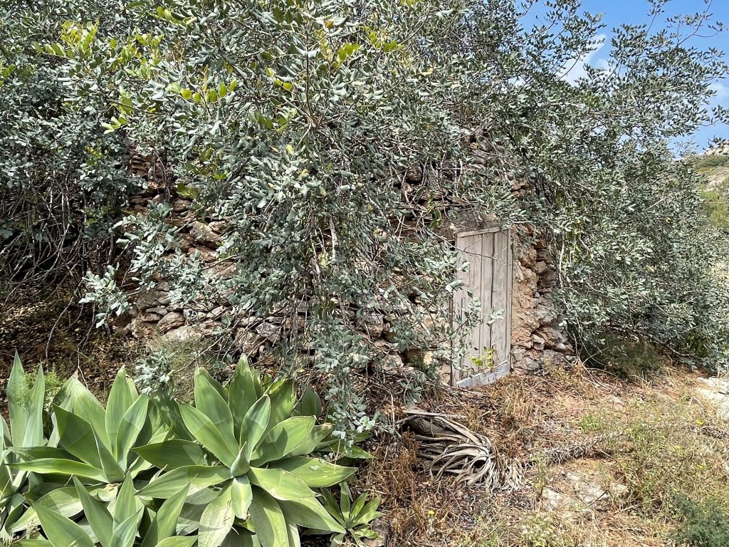 And here it is, mostly covered in brush. It’s about 12 feet in diameter, with an old rickety wooden door.