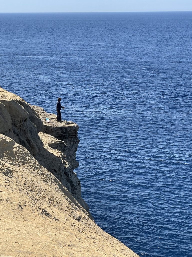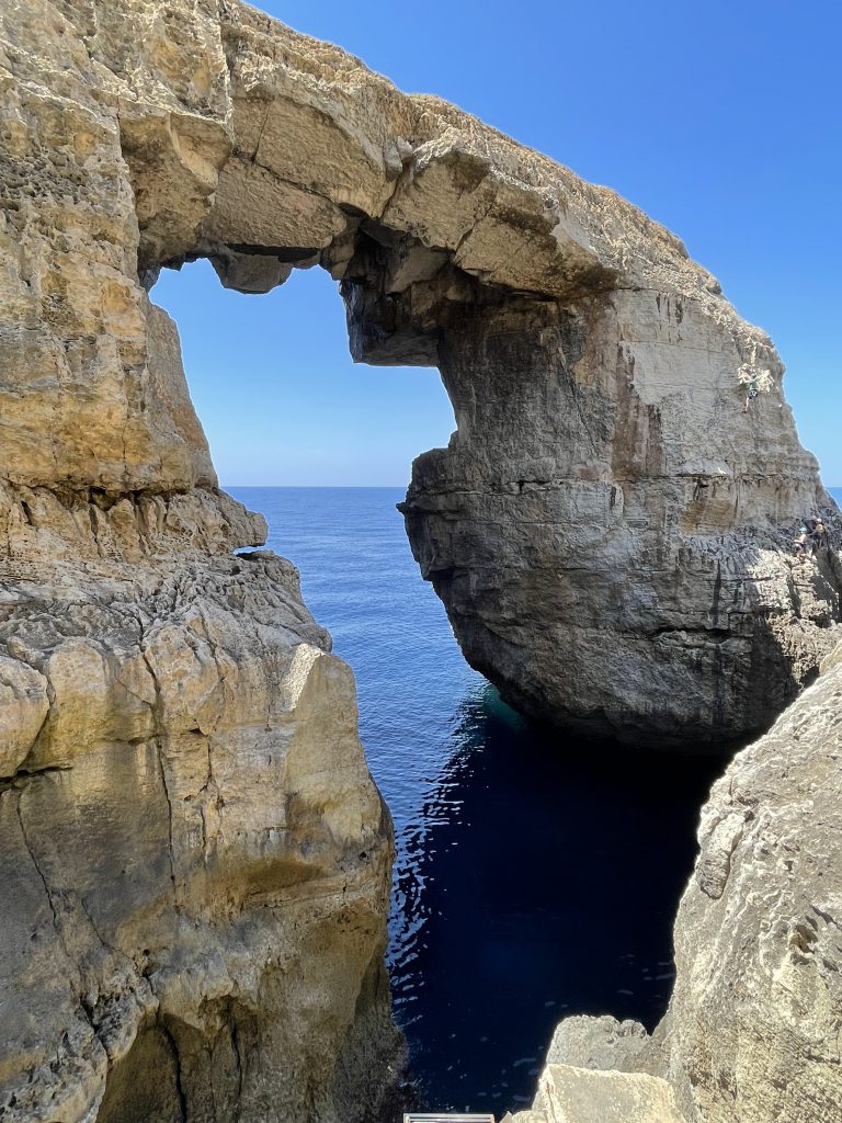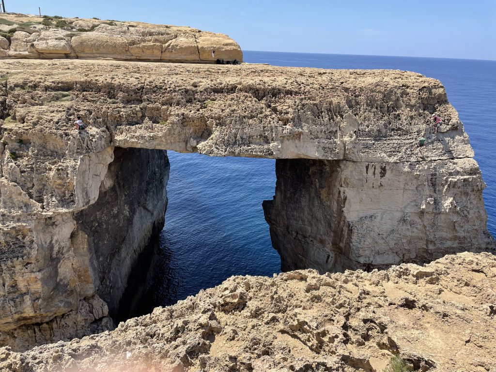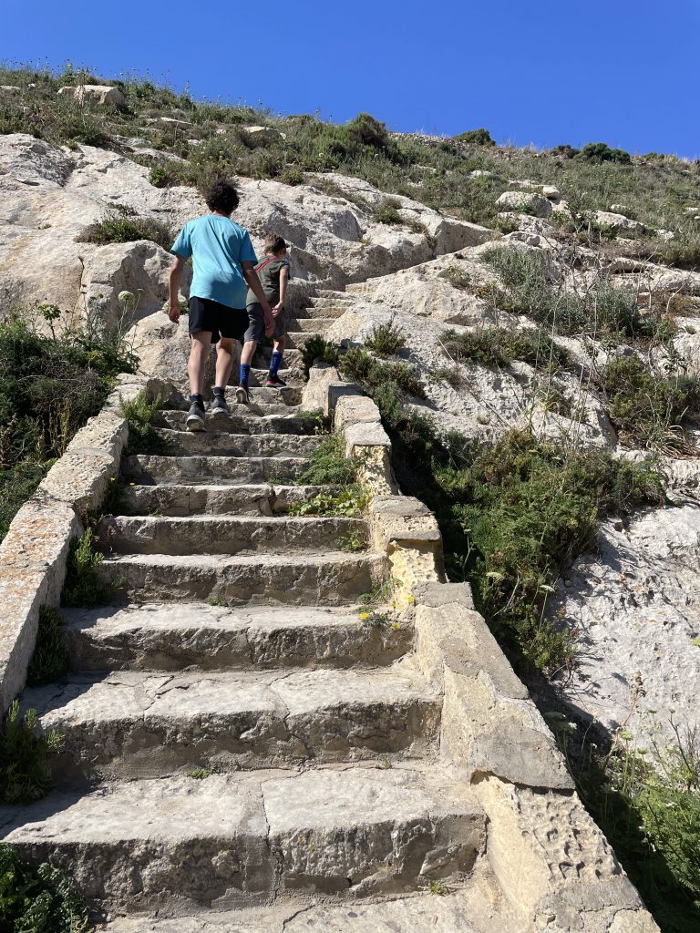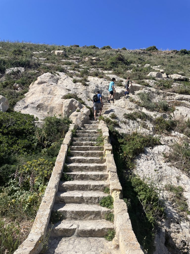 During the day we drove to the northwest portion of Gozo…we were off the beaten path visiting a window in the rock (at the bottom of Wied il-Mielah)…similar to, but different than the one at Dwejra which came crashing down in 2018. When we returned to the van, I noticed the left front tire was quite low. Like, very uncomfortably low. And there are no gas stations for miles. And there was no cell service.