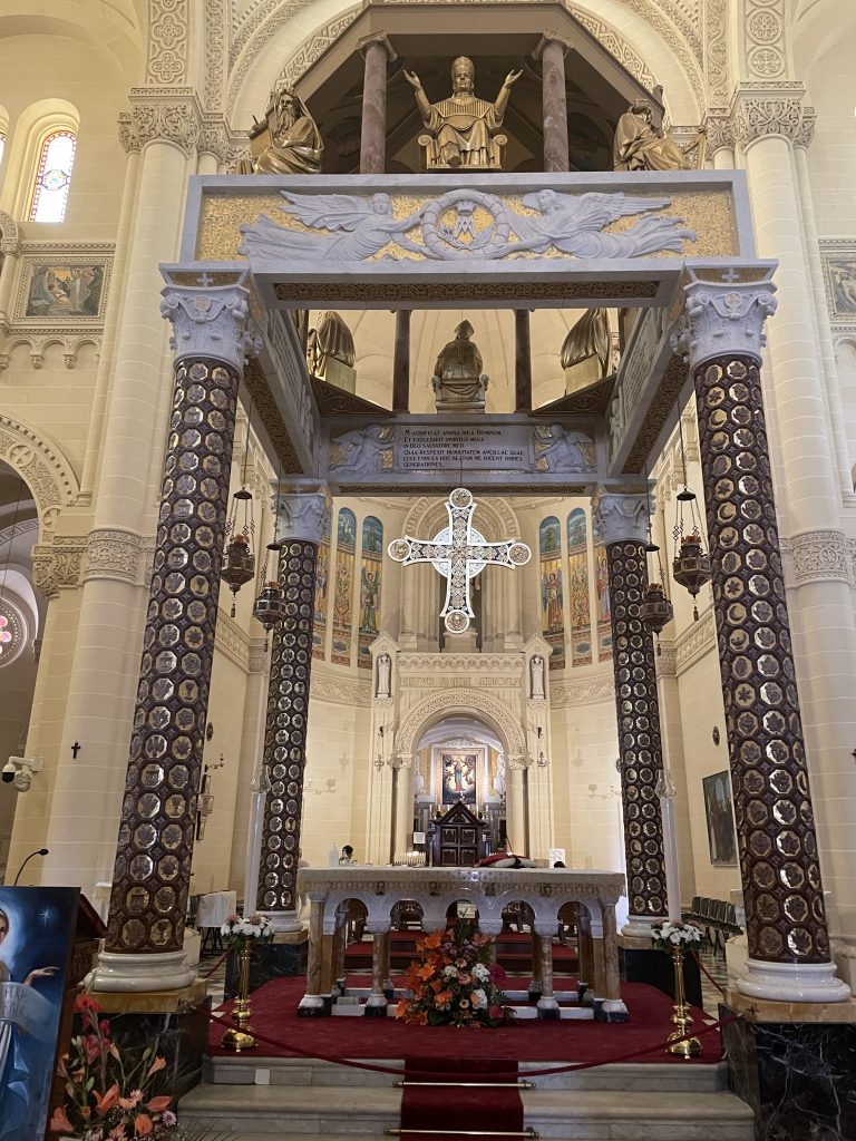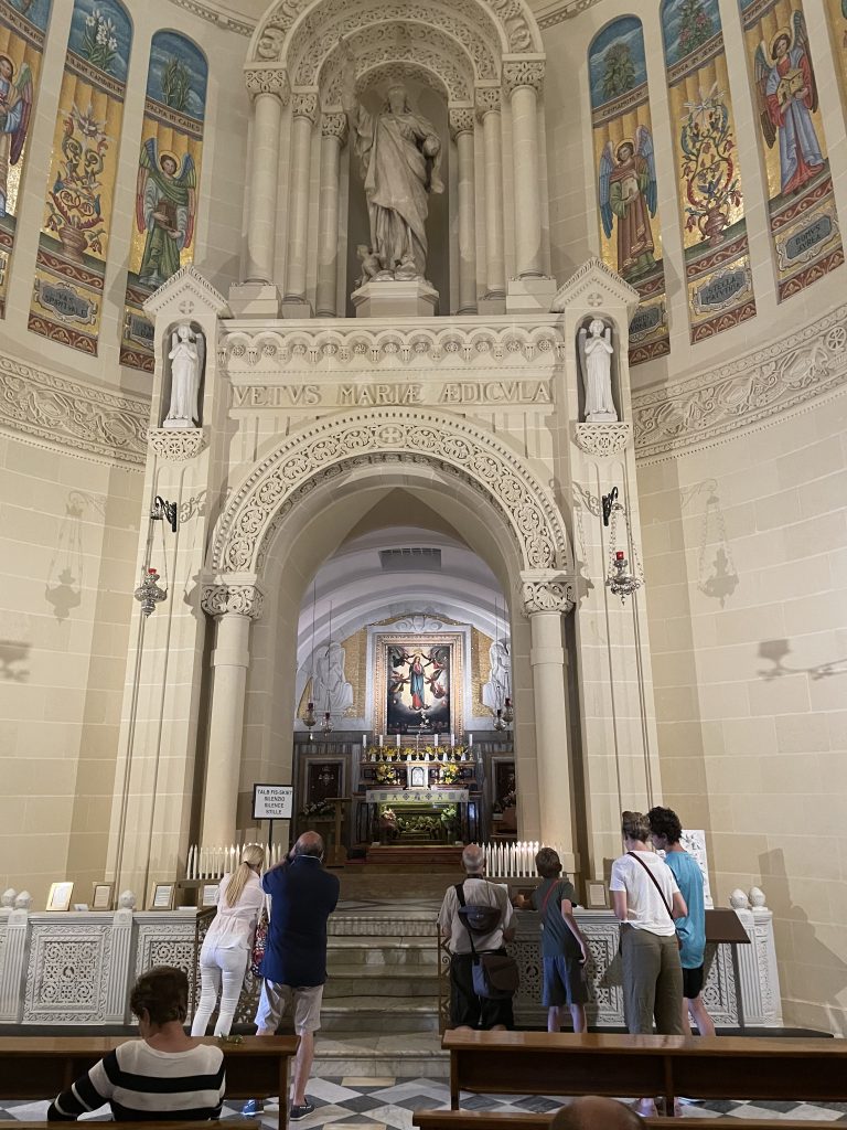 From there we went to Ta’ Pinu to a church which was a favourite of my parents. The story goes that in 1883, a Maltese peasant was walking by the church and heard a voice to recite 3 hail Mary’s. Over the following years, miracles were attributed to this event and the church was then dedicated to The Assumption (Mary). Today, there is a side gallery of sorts with pictures and letters of people who claimed to have been the recipient of a miracle. There are also devices, such as crutches and casts of people who prayed for restitution of their ailments, and no longer needed these devices.