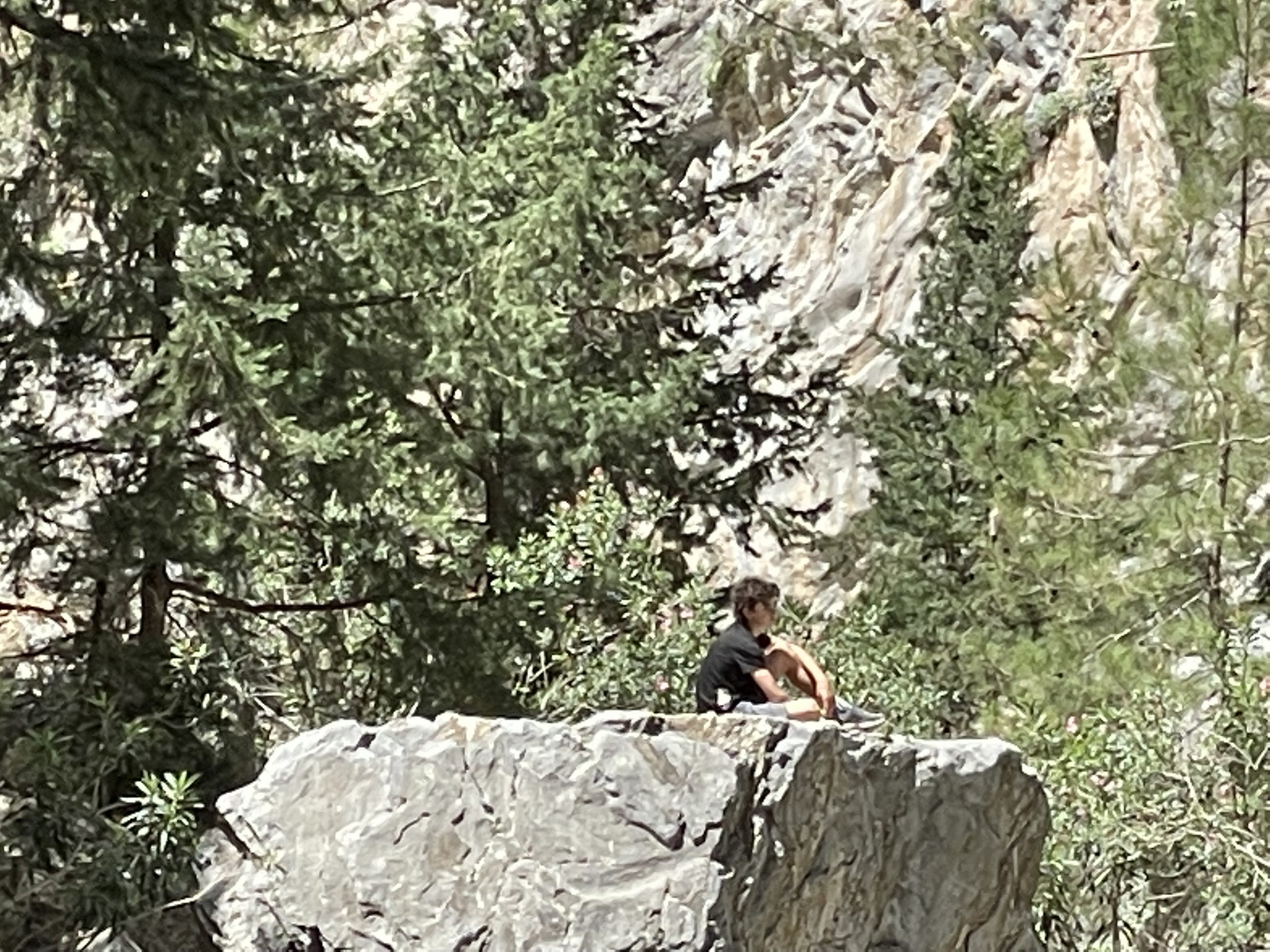 Up at 5am. We walked to a nearby hotel to catch the bus at 6am. We drove through the mountains with tons of ups and downs and switch-backs. We are a family of people who get car sick…but everyone mostly slept so that was helpful. We arrived in Omalos at 7am where a little restaurant (that has clearly done this before) had coffee and juice and sandwiches ready. We arrived at the gorge entrance just before 8am and paid our entry (kids under 18 are free – is that an omen?). Within the first 2 km, Daniel lost his hat into the gorge…it kept falling for many many seconds. It could not be rescued. We also came across falling rock signs that I found humorous; telling you to “walk fast.” I think if you are going to be in the wrong place at the wrong time, walking fast is not going to change that!
